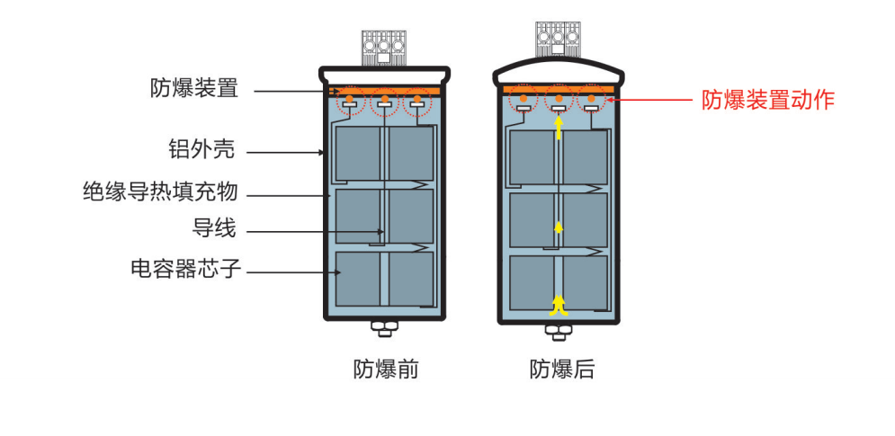 ● 防爆裝置;當(dāng)電容器內(nèi)部發(fā)生故障,溫度持續(xù)升高導(dǎo)致聚丙烯膜自愈能力下降或者損壞,產(chǎn)生氣體壓力,過壓保護(hù)裝置會在壓力作用下變形升高,進(jìn)行防爆泄壓。